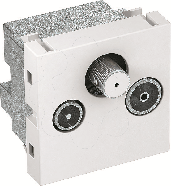 Tomada TV/FM para antenas, de banda larga e de sistemas de receção satélite com ligação para TV, rádio e SAT. Frequência: 5-2150 MHz Atenuação de desacoplamento: 5-862 MHz - 1 dB 950-2150 MHz - 2 dB Atenuação de canal de retorno: 14 dB Classe de proteção CEM A