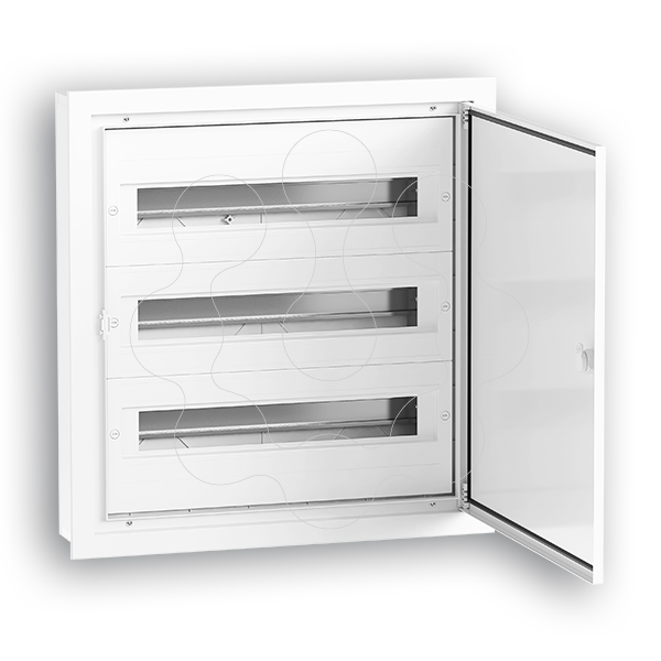Caixas Quadro, de 16 a 72 módulos, com 125mm de profundidade. Inclui barramentos isolados neutro e terra, máscaras e etiquetas de marcação de circuitos. Chassi amovível.