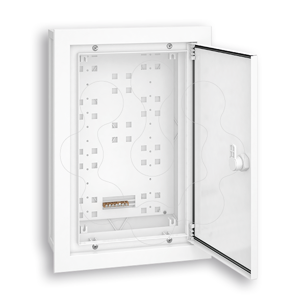 Caixa base em material plástico, aro e porta em alumínio lacado a branco e placa de montagem metálica. Inclui fechadura triangular plástica com chave. Kit reforço da Resistência Mecânica para aplicação saliente (cód. 0022012), conferindo grau de protecção contra impactos mecânicos IK09.