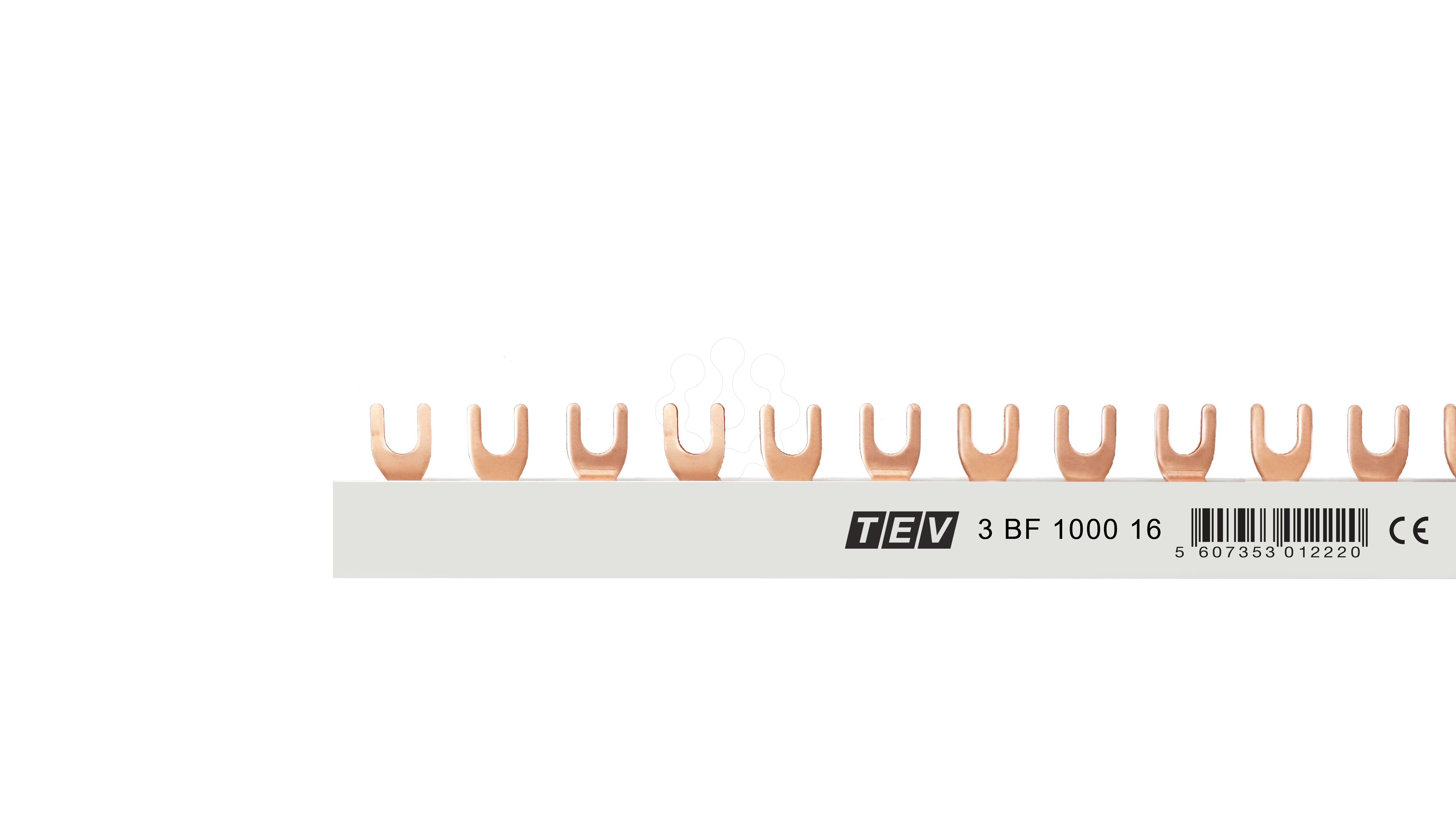 BARR. FORQ. 16mm² 1000 mm 3P. BARRAMENTO DE FORQUILHA 16mm² 1000mm TRIPOLAR. Em conformidade com a norma EN 61439-1-6 Cobre Eº CU S8/F25 - DIN 1787 Isolamento em plástico auto-extinguível - Ultramid Resistência a curto circuitos <25KA Sem halogéneos