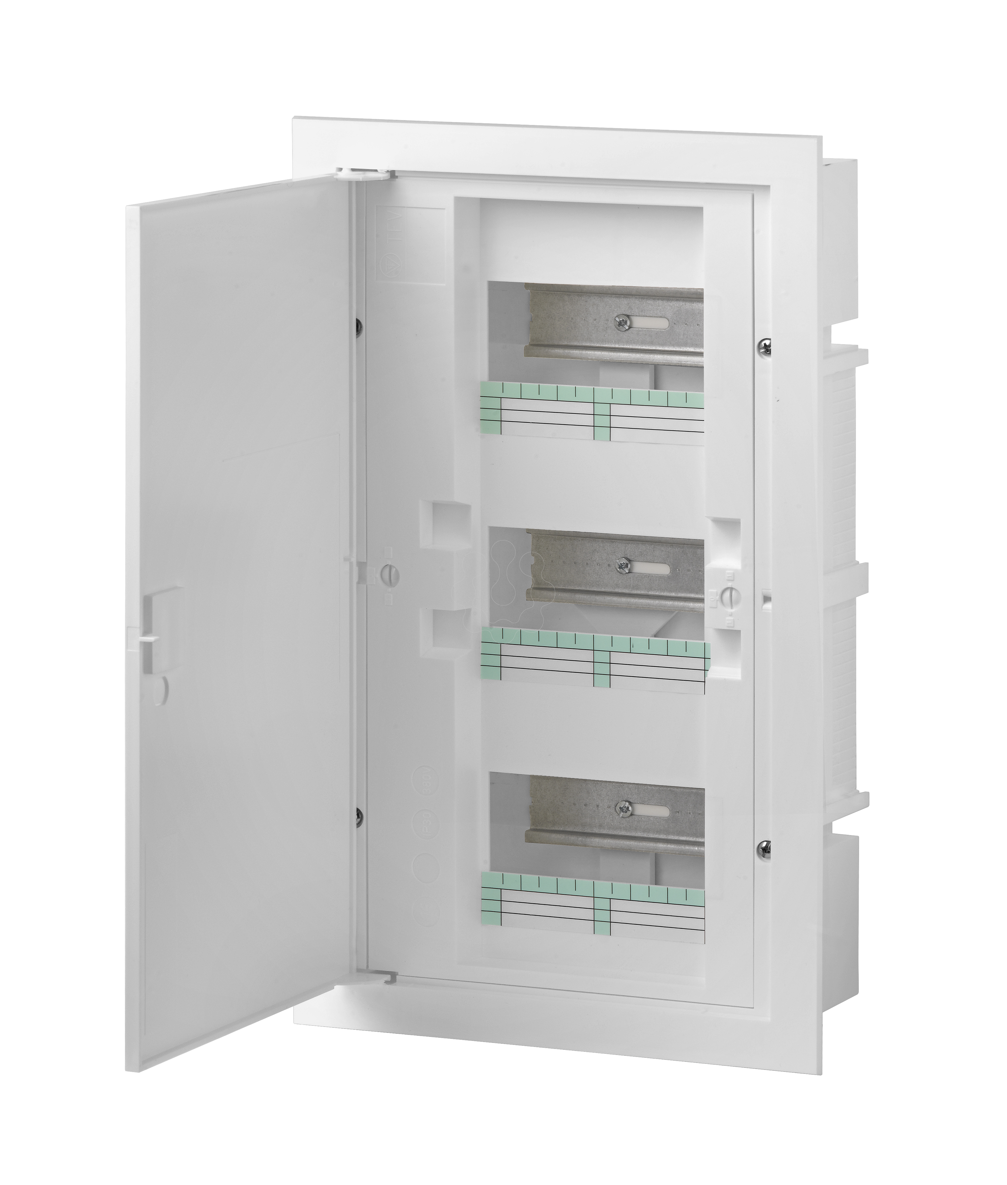 QDR DIST EMB. IP30 PT. OPC 3F 18M BRC. QUADRO DE DISTRIBUIÇÃO MONTAGEM EMBUTIDA IP30 PORTA OPACA 3 FILAS 18 MÓDULOS BRA. Em conformidade com a norma EN 61439-3 Para montagem de embutir Fabricado em termoplástico Cor: branco RAL 9010 Capacidade de 1 fila, 18 módulos Porta reversível Instalação de equipamentos em calha DIN (35 mm) EN50022 Caracteristicas mecânicas: material poliestireno Tensão de isolamento 400V Humidade máxima (50%HR a + 40ªC) Classe II de isolamento IP30/IK07 Sem halogéneos Acessórios incluidos: Equipado com ligador T/N Etiqueta para identificação do circuito Opção: Cor cinza RAL 7035