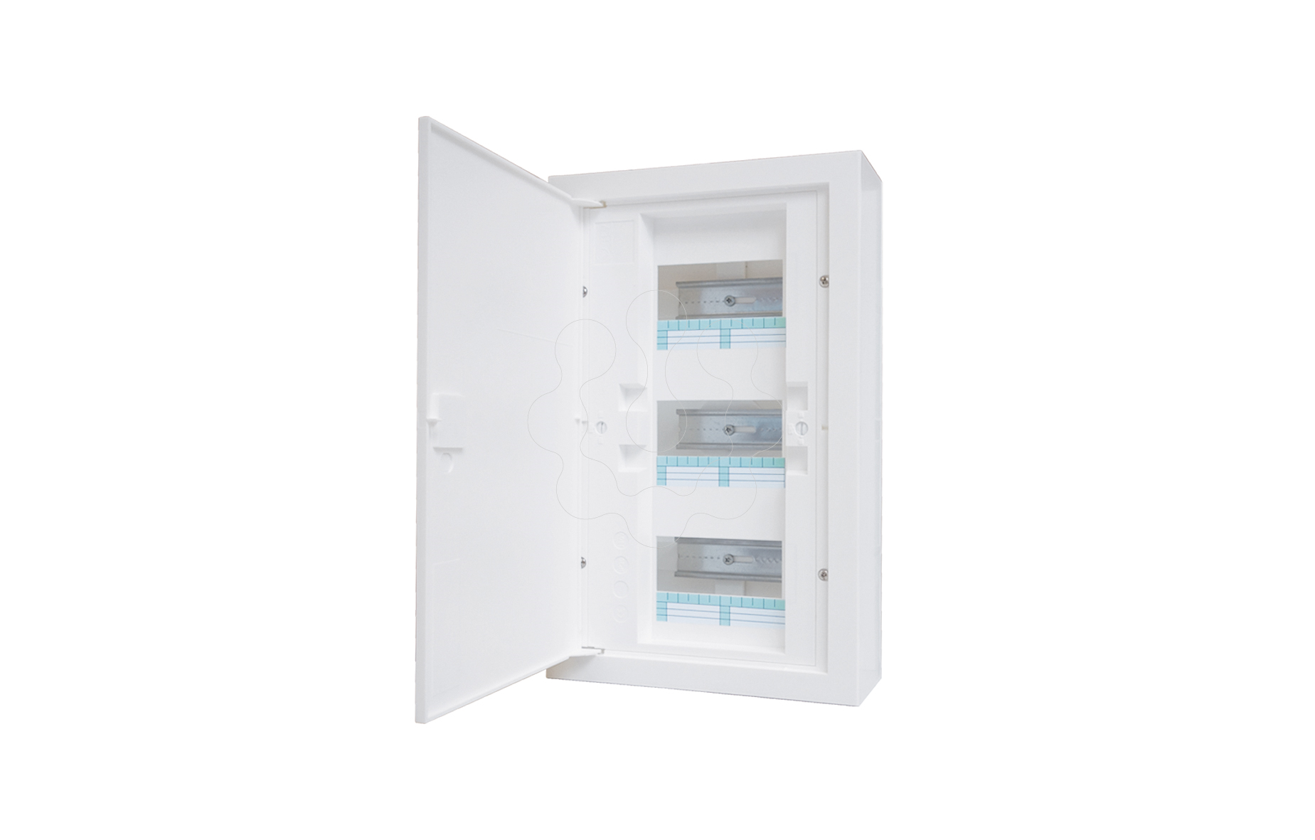 QDR DIST SAL. IP30 PT OPC 3F 18M BRC. QUADRO DE DISTRIBUIÇÃO MONTAGEM SALIENTE IP30 PORTA OPACA 3 FILAS 18 MÓDULOS BRA. Em conformidade com a norma EN 61439-3 Para montagem saliente Fabricado em termoplástico Cor: branco RAL 9010 Porta opaca, reversível a 180º Instalação de equipamentos em calha (35 mm) EN50022 Caracteristicas mecânicas: material poliestireno Tensão de isolamento 400V Humidade máxima (50%HR a + 40ªC) Classe II de isolamento IP30/IK07 Sem halogéneos Acessórios incluidos: Equipado com ligador T/N Etiqueta para identificação do circuito