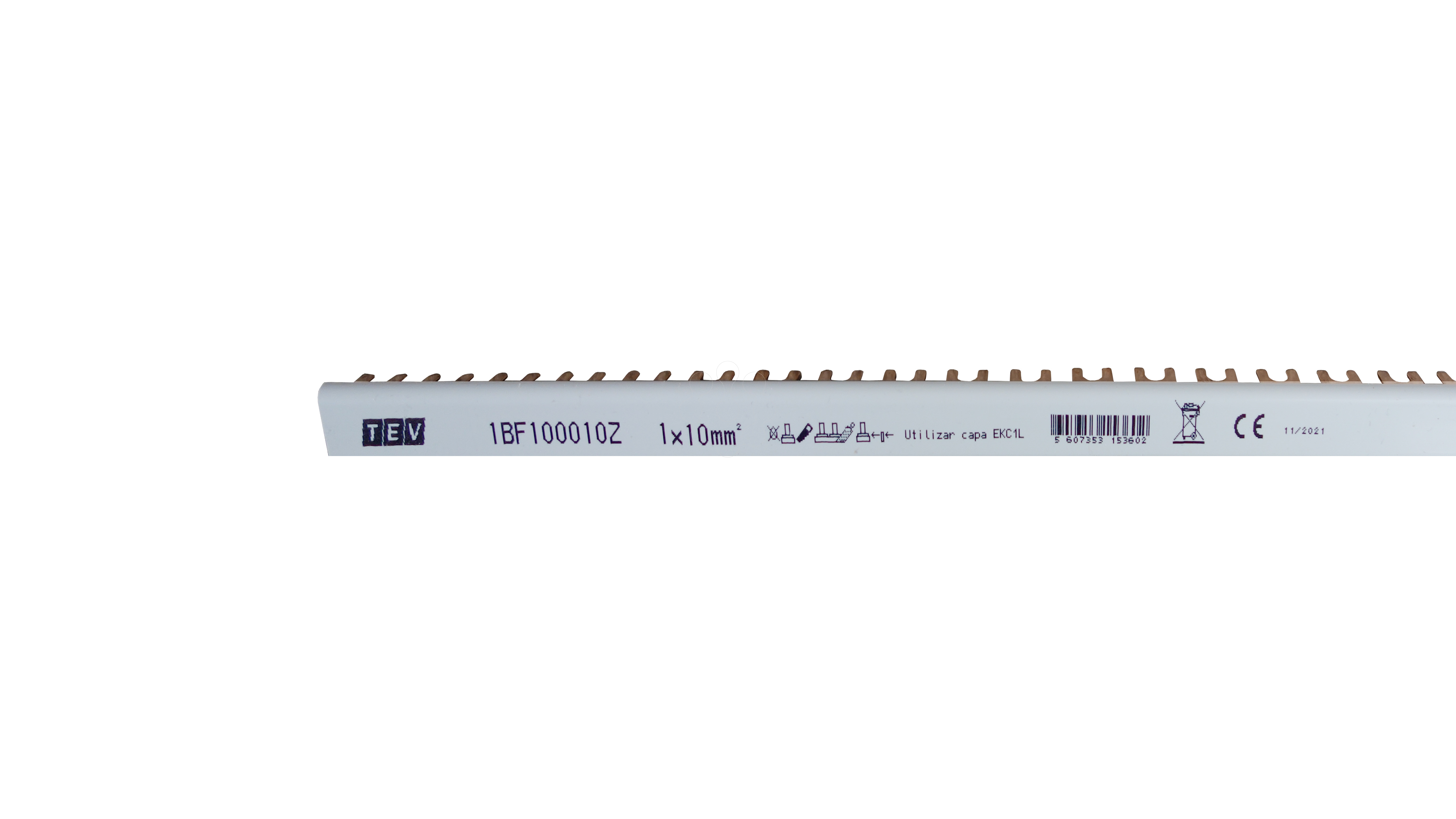 BARR FORQ 10 mm² 1000 mm 1P. BARRAMENTO DE FORQUILHA 12mm² 1000mm UNIPOLAR. Em conformidade com a norma EN 61439-1-6 Cobre Eº CU S8/F25 - DIN 1787 Isolamento em plástico auto-extinguível - Ultramid Resistência a curto circuitos <25KA Sem halogéneos