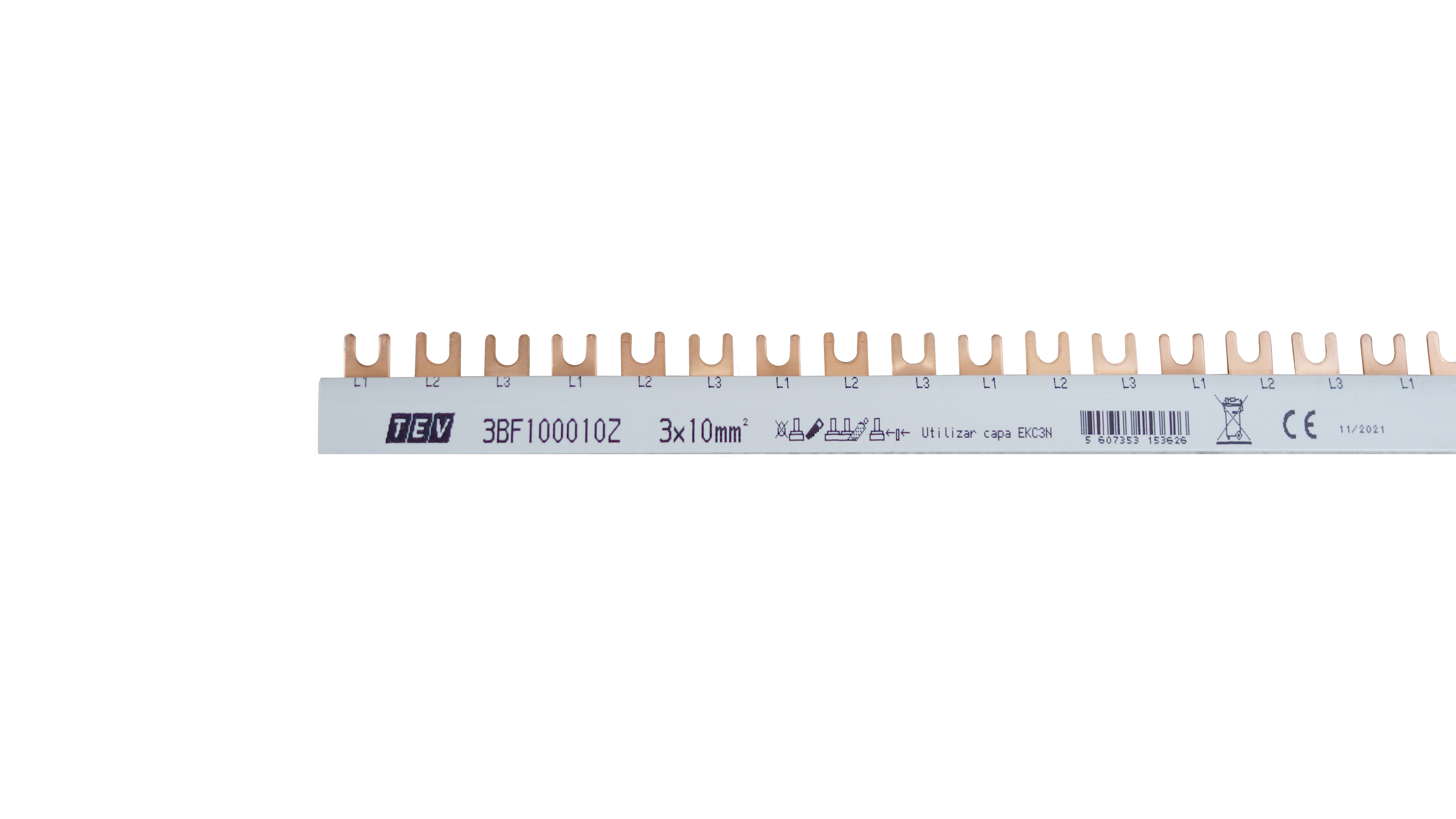 BARR FORQ 10 mm² 1000 mm 3P. BARRAMENTO DE FORQUILHA 10mm² 1000mm TRIPOLAR. Em conformidade com a norma EN 61439-1-6 Cobre Eº CU S8/F25 - DIN 1787 Isolamento em plástico auto-extinguível - Ultramid Resistência a curto circuitos <25KA Sem halogéneos