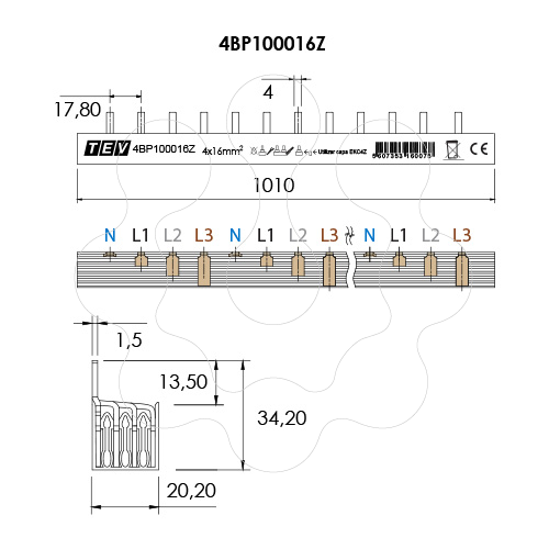 BARR. PONT. 16 mm² 1000 mm 4P. BARRAMENTO DE PONTEIRA 16mm² 1000mm TETRAPOLAR. Em conformidade com a norma EN 61439-1-6 Cobre Eº CU S8/F25 - DIN 1787 Isolamento em plástico auto-extinguível - Ultramid Resistência a curto circuitos <25KA Sem halogéneos