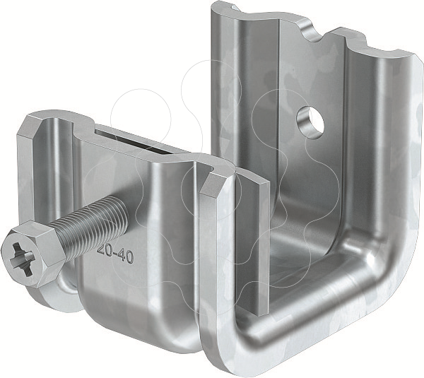 Este tipo de clip de suspensão é encaixado no apoio e fixo à viga ou ferro plano usando uma placa de pressão e um parafuso (M8). O parafuso hexagonal tem um WAF de 10 mm. No clip estão também incorporadas duas roscas M6 adicionais para, por exemplo, fixar um varão roscado.