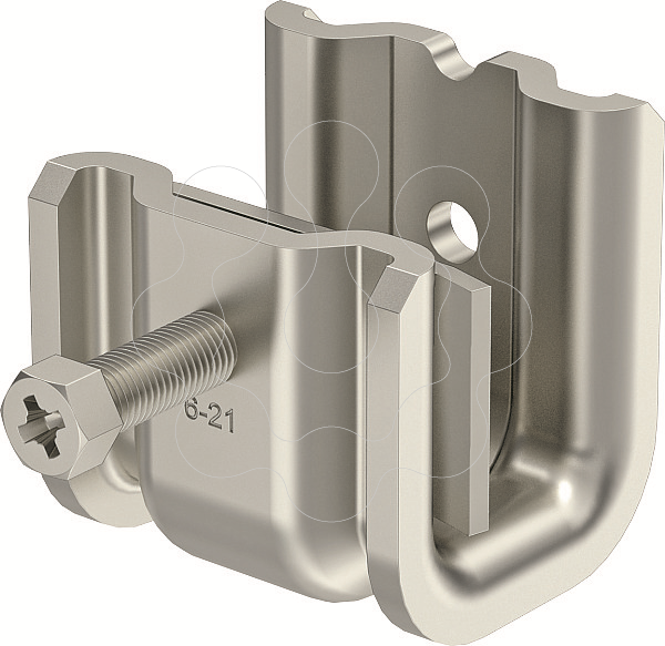 Este tipo de clip de suspensão é encaixado no apoio e fixo à viga ou ferro plano usando uma placa de pressão e um parafuso (M8). O parafuso hexagonal tem um WAF de 10 mm. No clip estão também incorporadas duas roscas M8 adicionais para, por exemplo, fixar um varão roscado.