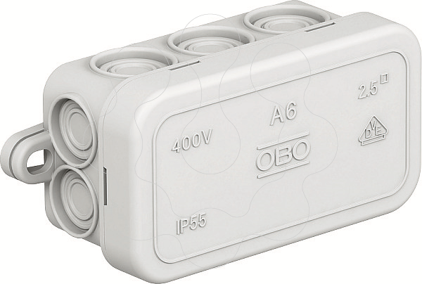 Tipo de proteção IP55, tensão nominal 400 V, secção transversal nominal 2,5 mm², 6 entradas para cabos com diâmetro de 5-14 mm 4 entradas para cabos com diâmetro de 5-9 mm. Tampa de aperto. Dimensões: 80 x 43 x 36 mm Dimensões internas: 69 x 32 x 30 mm Por cada 10 caixas 1 ferramenta de corte