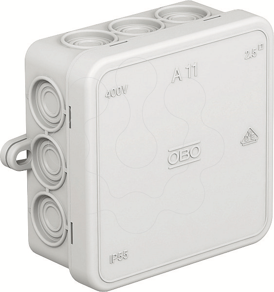 Tipo de proteção IP55, tensão nominal 400 V, secção transversal nominal 2,5 mm², 12 entradas para cabos com diâmetro de 5-14 mm. Tampa de aperto.Dimensões: 85 x 85 x 40 mm Dimensões internas: 75 x 75 x 35 mm Por cada 10 caixas 1 ferramenta de corte