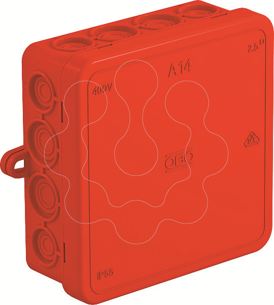 Grau de proteção IP55, tensão nominal 400 V, secção transversal nominal 2,5 ÷ mm², 8 entradas para cabos com diâmetro de 5-14 mm 8 entradas para cabos com diâmetro de 5-11 mm. Tampa de encaixe. Dimensões: 100 x 100 x 40 mm Dimensões internas: 90 x 90 x 35 mm Por cada 10 caixas 1 ferramenta de corte