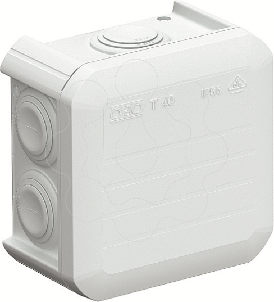 Caixa de derivação para conectar cabos em áreas interiores e áreas exteriores protegidas. Forma quadrada com bucins cónicos nas laterais e entradas quebráveis na base. Adequado para a montagem na parede / teto e para a montagem em suportes para caixas de derivação. Com opção de fixação interna. Com tampa de aperto fixa. Fabricado em materiais livres de halogéneo e resistentes aos UV. Caixa de derivação de acordo com a DIN EN 60670. Resistente ao fio incandescente segundo a DIN EN 60695-2-11, temperatura de ensaio 650 °C. Resistência ao impacto IK07 de acordo com a DIN EN 50102.