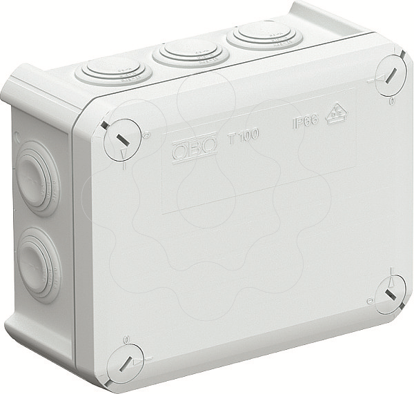 Caixa de derivação para conectar cabos em áreas interiores e áreas exteriores protegidas. Forma retangular com bucins cónicos nas laterais e entradas quebráveis na base. Adequado para a montagem na parede / teto e para a montagem em suportes para caixas de derivação. Com opção de fixação interna e montagem através de parafusos nos cantos. Tampa com fecho rápido, pode ser selada a chumbo. Fabricado em materiais livres de halogéneo e resistentes aos UV. Caixa de derivação de acordo com a DIN EN 60670. Resistente ao fio incandescente segundo a DIN EN 60695-2-11, temperatura de ensaio 650 °C. Resistência ao impacto IK07 de acordo com a DIN EN 50102.