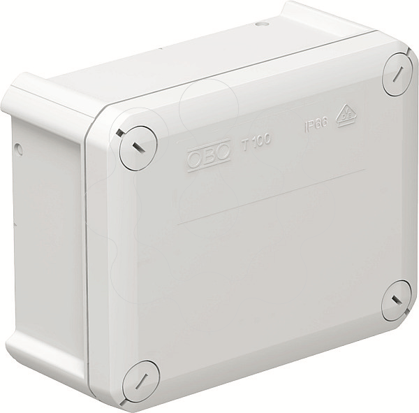 Caixa de derivação para conectar cabos em áreas interiores e áreas exteriores protegidas. Forma retangular sem entradas. Adequado para a montagem na parede / teto e para a montagem em suportes para caixas de derivação. Com opção de fixação interna e montagem através de parafusos nos cantos. Tampa com fecho rápido, pode ser selada a chumbo. Fabricado em materiais livres de halogéneo e resistentes aos UV. Caixa de derivação de acordo com a DIN EN 60670. Resistente ao fio incandescente segundo a DIN EN 60695-2-11, temperatura de ensaio 650 °C. Resistência ao impacto IK07 de acordo com a DIN EN 50102.