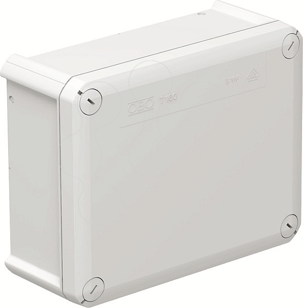 Caixa de derivação para conectar cabos em áreas interiores e áreas exteriores protegidas. Forma retangular sem entradas. Adequado para montagem na parede e teto e a montagem em suportes para caixas de derivação com opção para fixação externa e montagem através de parafusos nos cantos. Tampa com fecho rápido, pode ser selada a chumbo. Fabricado em materiais livres de halogéneo e resistentes aos UV. Caixa de derivação de acordo com a DIN EN 60670. Resistente ao fio incandescente segundo a DIN EN 60695-2-11, temperatura de ensaio 650 °C. Resistência ao impacto IK05 de acordo com a DIN EN 50102.