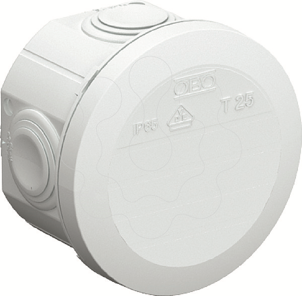 Caixa de derivação para conectar cabos em áreas interiores e áreas exteriores protegidas. Forma redonda com bucins cónicos nas laterais e entradas quebráveis no base. Adequado para a montagem na parede e teto, a montagem em suportes para caixas de derivação e na base da caixa. Com opção de fixação interna. Com tampa de aperto fixa. Fabricado em materiais livres de halogéneo. Versão resistente ao fio incandescente em polipropileno especial. Caixa de derivação de acordo com a DIN EN 60670. Resistente ao fio incandescente segundo a DIN EN 60695-2-11, temperatura de ensaio 960°C. Resistência ao impacto IK07 de acordo com a DIN EN 50102.