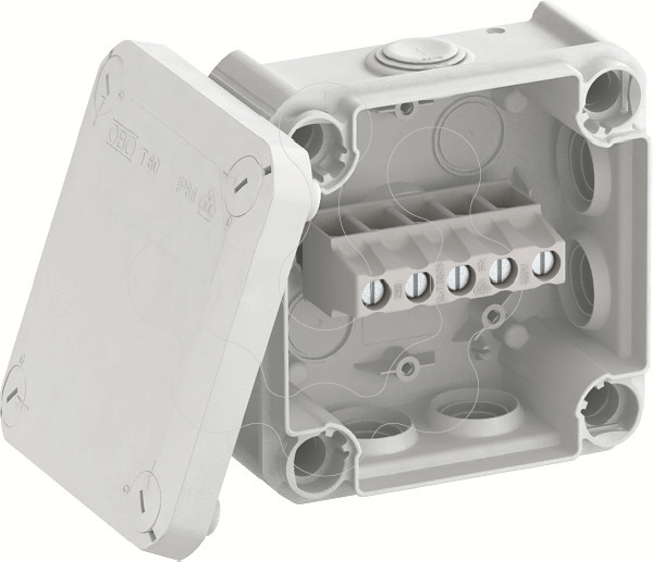 Caixa de derivação com régua de bornes para conectar cabos em áreas interiores e áreas exteriores protegidas. Forma quadrada com bucins cónicos nas laterais e entradas quebráveis na base. Adequado para a montagem na parede / teto e para a montagem em suportes para caixas de derivação. Com opção de fixação interna e montagem através de parafusos nos cantos. Tampa com fecho rápido, pode ser selada a chumbo. Fabricado em materiais livres de halogéneo e resistentes aos UV. Caixa de derivação de acordo com a DIN EN 60670. Resistente ao fio incandescente segundo a DIN EN 60695-2-11, temperatura de ensaio 650 °C. Resistência ao impacto IK07 de acordo com a DIN EN 50102.