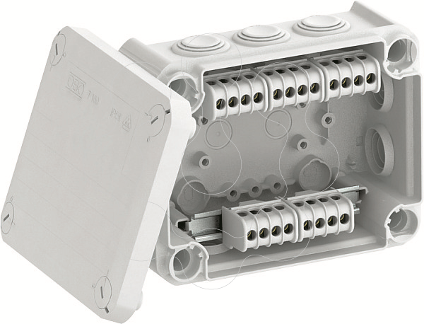 Caixa de derivação com régua de bornes para conectar cabos em áreas interiores e áreas exteriores protegidas. Forma retangular com bucins cónicos nas laterais e entradas quebráveis na base. Adequado para a montagem na parede / teto e para a montagem em suportes para caixas de derivação. Com opção de fixação interna e montagem através de parafusos nos cantos. Tampa com fecho rápido, pode ser selada a chumbo. Fabricado em materiais livres de halogéneo e resistentes aos UV. Caixa de derivação de acordo com a DIN EN 60670. Resistente ao fio incandescente segundo a DIN EN 60695-2-11, temperatura de ensaio 650 °C. Resistência ao impacto IK07 de acordo com a DIN EN 50102.