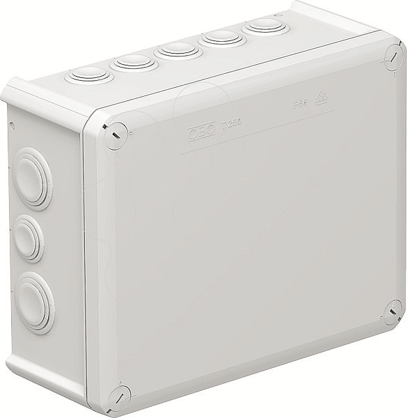 Caixa de derivação para conectar cabos em áreas interiores e áreas exteriores protegidas. Forma retangular com bucins cónicos nas laterais e entradas quebráveis na base. Adequado para a montagem na parede e teto, a montagem em suportes para caixas de derivação e na base da caixa. Com opção de fixação interna e montagem através de parafusos nos cantos. Tampa com fecho rápido, pode ser selada a chumbo. Fabricado em materiais livres de halogéneo e resistentes aos UV. Caixa de derivação de acordo com a DIN EN 60670. Resistente ao fio incandescente segundo a DIN EN 60695-2-11, temperatura de ensaio 650 °C. Resistência ao impacto IK05 de acordo com a DIN EN 50102.