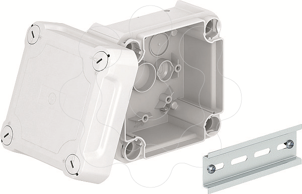Caixa de derivação fechada para conectar cabos e condutas na área interior e áreas exteriores protegidas. Forma quadrada sem entradas. Adequado para a montagem na parede / teto e para a montagem em suportes para caixas de derivação. Com opção de fixação interna e montagem através de parafusos nos cantos. Tampa alta com fecho rápido, pode ser selada a chumbo. Fabricado em materiais livres de halogéneo e resistentes aos UV.Incluindo calha DIN perfilada Caixa de derivação de acordo com a DIN EN 60670. Resistente ao fio incandescente segundo a DIN EN 60695-2-11, temperatura de ensaio 650 °C. Resistência ao impacto IK07 de acordo com a DIN EN 50102.
