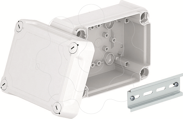 Caixa de derivação fechada para conectar cabos e condutas na área interior e áreas exteriores protegidas. Forma retangular sem entradas. Adequado para a montagem na parede / teto e para a montagem em suportes para caixas de derivação. Com opção de fixação interna e montagem através de parafusos nos cantos. Tampa alta com fecho rápido, pode ser selada a chumbo. Fabricado em materiais livres de halogéneo e resistentes aos UV.Incluindo calha DIN perfilada Caixa de derivação de acordo com a DIN EN 60670. Resistente ao fio incandescente segundo a DIN EN 60695-2-11, temperatura de ensaio 650 °C. Resistência ao impacto IK07 de acordo com a DIN EN 50102.