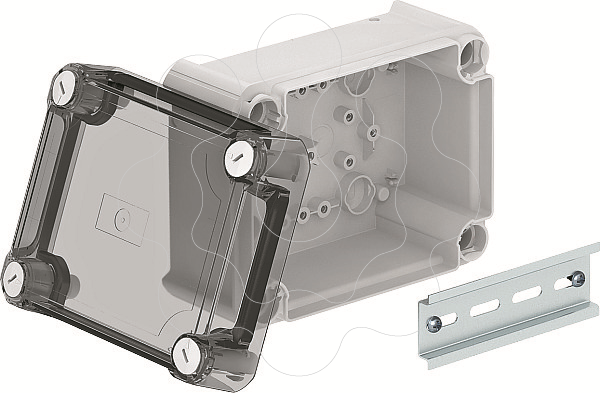 Caixa de derivação fechada para conectar cabos e condutas na área interior e áreas exteriores protegidas. Forma retangular sem entradas. Adequado para a montagem na parede / teto e para a montagem em suportes para caixas de derivação. Com opção de fixação interna e montagem através de parafusos nos cantos. Tampa alta, transparente, com fecho rápido, pode ser selada a chumbo. Fabricado em materiais livres de halogéneo e resistentes aos UV. Incluindo calha DIN perfilada Caixa de derivação de acordo com a DIN EN 60670. Resistente ao fio incandescente segundo a DIN EN 60695-2-11, temperatura de ensaio 650 °C. Resistência ao impacto IK07 de acordo com a DIN EN 50102.