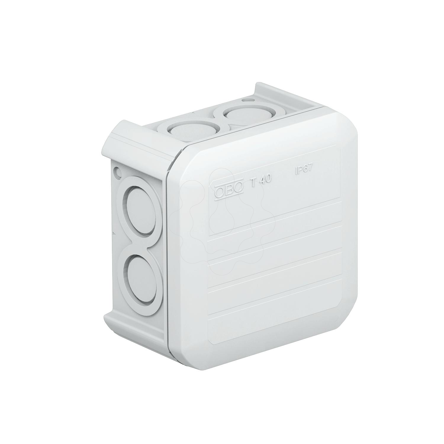 Caixa de derivação para conectar cabos em áreas interiores e áreas exteriores protegidas. Forma quadrada com entradas quebráveis nas laterais e entradas quebráveis na base. Adequado para a montagem na parede / teto e para a montagem em suportes para caixas de derivação. Com opção de fixação interna e montagem através de parafusos nos cantos. Com tampa de aperto fixa. Fabricado em materiais livres de halogéneo e resistentes aos UV. Caixa de derivação de acordo com a DIN EN 60670. Resistente ao fio incandescente segundo a DIN EN 60695-2-11, temperatura de ensaio 650 °C. Resistência ao impacto IK07 de acordo com a DIN EN 50102.