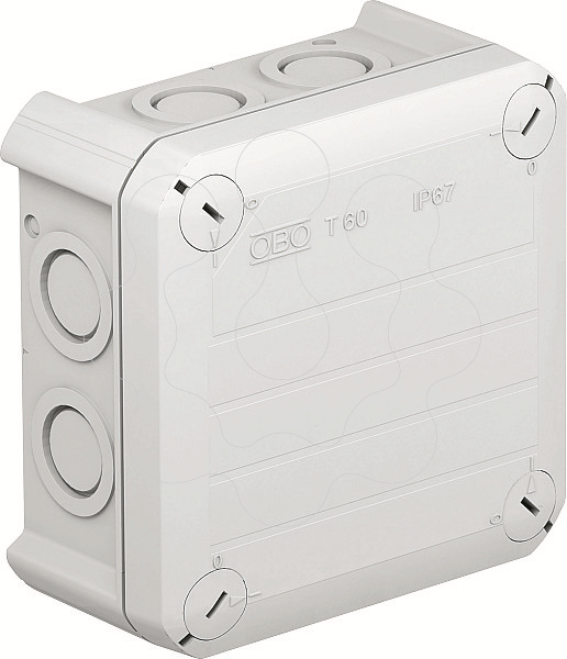 Caixa de derivação para conectar cabos em áreas interiores e áreas exteriores protegidas. Forma quadrada com entradas quebráveis nas laterais e entradas quebráveis na base. Adequado para a montagem na parede / teto e para a montagem em suportes para caixas de derivação. Com opção de fixação interna e montagem através de parafusos nos cantos. Com tampa de aperto fixa. Fabricado em materiais livres de halogéneo e resistentes aos UV. Caixa de derivação de acordo com a DIN EN 60670. Resistente ao fio incandescente segundo a DIN EN 60695-2-11, temperatura de ensaio 650 °C. Resistência ao impacto IK07 de acordo com a DIN EN 50102.