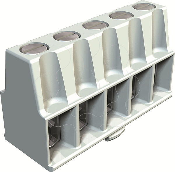 Régua de bornes e parafusos em aço galvanizados e passivados, secção transversal nominal 1,5 ÷ 6 mm², tensão nominal 400 V, 5 pólos, secção transversal máx. que pode ser ligada por cada ponto de aperto: 3x6mm², 4x4mm² ou 6x2,5mm².