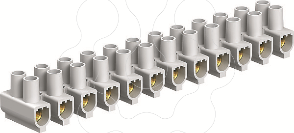 Testada de acordo com a norma EN 60998. Bornes em latão, parafusos em aço, galvanizados a zinco e passivados de forma transparente, de 12 polos, régua separável em réguas de bornes individuais. Parafusos imperdíveis. Temperatura ambiente máx. permitida conforme EN 60998: -5 a +80 °C. Secção transversal nominal: 25 - mm² Tensão nominal: 750 V Corrente nominal: 101 A Ligação máxima por borne: 25 mm² de cabo multifilar ou 16 mm² de fio fino.