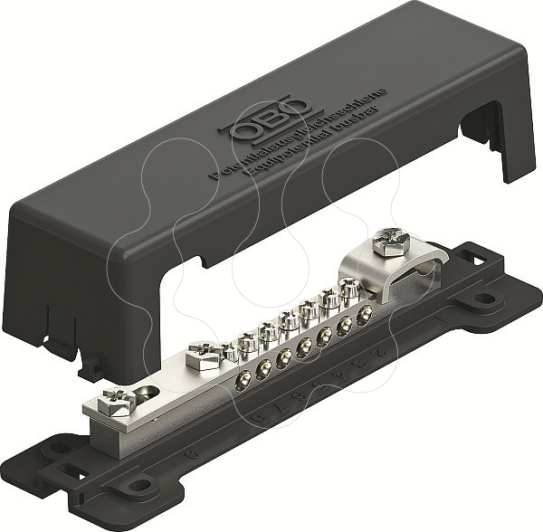 Régua equipotencial de terras para sistemas de equipotencialização conforme a DIN VDE 0100-410/-540, bem como para compensação de potência para proteção contra descargas atmosféricas conforme a DIN VDE 0185-305 • Cobertura e placa de base em poliestireno • Cores: preto, resistente aos raios UV • Parafusos e tampa em VA • Capacidade para corrente de descargas atmosféricas 50 kA (10/350) Possibilidades de ligação: • 7 cabos unifilares ou multifilares rígidos até 25 mm² ou cabos flexíveis até 16 mm² • 1 condutor redondo Rd 8-10 • 1 fita plana até FL 30 ou condutor redondo Rd 8-10