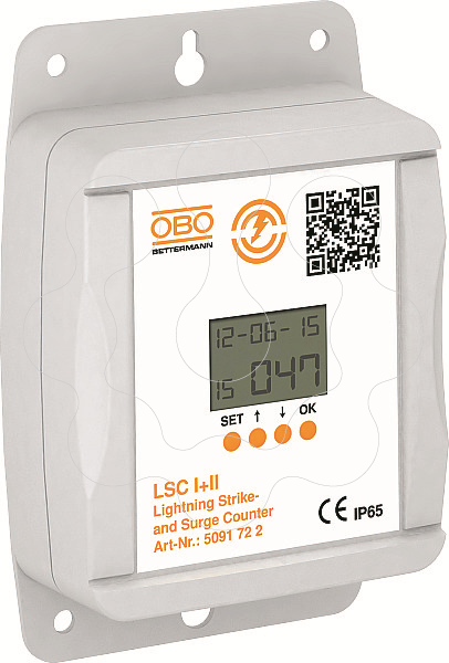 O contador de descargas atmosféricas LSC I+II regista as correntes de impulso e guarda-as em segurança juntamente com a hora e data. Desta forma é possível monitorizar regularmente se o sistema de proteção contra descargas atmosféricas é atingido por um raio. Se este for o caso, o sistema de proteção contra descargas atmosféricas deve receber manutenção em conformidade com a VDE 0185-305 (IEC 62305). • gravação e visualização de data e hora • utilização no interior e exterior graças à classe de proteção IP65 • abraçadeira para cabos de terras ou fitas • montagem direta no descarregador ou no cabo PE do aparelho de proteção contra sobretensões • elevado período de vida útil da bateria interna de lítio • visor LCD • bateria interna • testado de acordo com a VDE 0185-561-6 (IEC 62561-6)