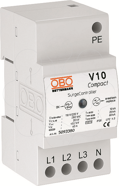 Descarregador de sobretensões módulo compacto tipo 2+3 • Proteção contra sobretensões em subdistribuições conforme a VDE 0100-443 (IEC 60364-4-44) • Capacidade de descarga até 60 kA (8/20) no total • Solução 3+1 integrada para sistema de rede TN e TT de largura de módulo de 45 mm • Tecnologia varistor de alto desempenho • Inclui dispositivo de separação térmico, dinâmico e visor ótico de funcionamento Aplicação: subdistribuição/distribuição de pisos, assim como proteção de equipamentos de sistemas trifásicos.