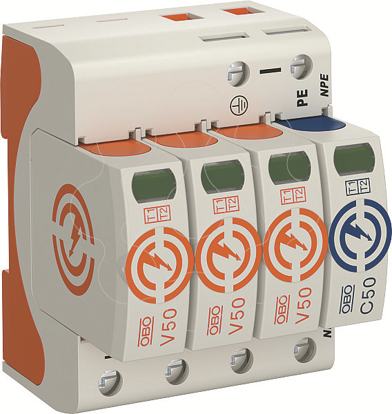 Descarregador combinado, de corrente de raio e sobretensões, tipo 1+2 • para ligação equipotencial de proteção contra descargas atmosféricas conforme a VDE 0185-305 (IEC 62305) • capacidade de descarga de correntes de raio 50kA (10/350)