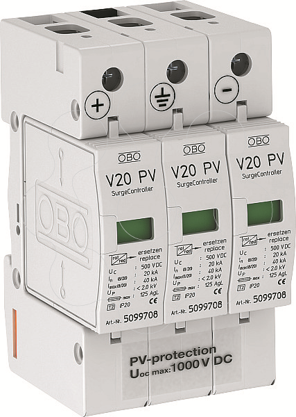 Descarregador de sobretensões V20 tipo 2 para instalações FV • Unidade completa à base de varistor, enfichável, com dispositivo de separação • Conexão em estrela, resistente a falhas conforme a VDE 0100-712 (EN 50539-12) • Ligação equipotencial de proteção contra sobretensões conforme a VDE 0100-443 (IEC 60364-4-44) • V20-C 3-PH-1000 testado segundo a EN 50539-11 (VDE / KEMA) • Capacidade de descarga até 40 kA (8/20) por polo • Baixo nível de proteção DC: < 4,0 kV e Uoc máx = 1000V DC • Com indicador visual de funcionamento para utilização em quadros de distribuição Aplicação: instalações FV sem ou com sistema isolado de proteção contra descargas atmosféricas.
