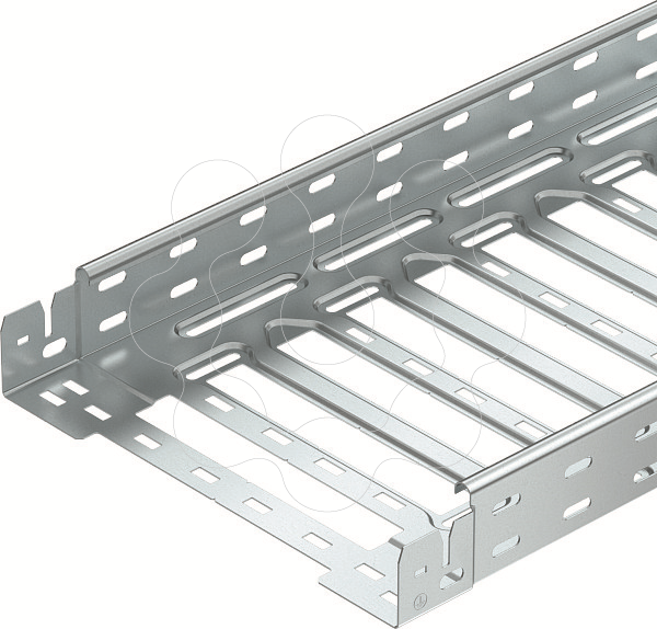 Caminho de cabos em chapa com união de encaixe rápido integrada. O comprimento útil do caminho de cabos em chapa é de 3.000 mm. O caminho de cabos possui uma perfuração lateral contínua de 7 x 20 mm para a instalação de componentes adicionais de ligação e montagem. Caminho de cabos com largura de 200 mm com perfuração de 30%, de acordo com a diretriz VdS 2092, adequado para uso em sistemas de aspersão.