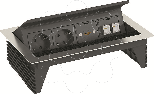 Deskbox oscilante com cabo de ligação para a instalação fixa em mesa, caixa em aço inoxidável polido com saída de cabos de escova. Instalação através de uma abertura de montagem no tampo da mesa de 245 x 157 mm. Equipamento: - duas tomadas de contacto pretas na direção de encaixe 60°, incl. cabo de rede de 3,0 m com ficha de tomada angular CEE 7/7. - uma tomada HDMI 1.3, incl. cabo de ligação de 3,0 m com ficha. - dois conectores de dados RJ45, interconectados 1:1, cat.6 blindados. Nota: para utilização em placas de mesa com espessura até 50 mm.