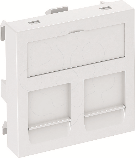 Espelho plano Modul 45 para 2 conectores de dados RJ 45. A saída tem uma tampa deslizante de bloqueio, adequada tanto para a instalação vertical como horizontal. O Tipo RM tem um módulo especial de alojamento e foi concebido para a fixação indireta de conectores de dados na abertura de montagem.