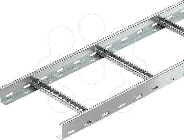 Caminho de cabos tipo escada com altura lateral de 60 mm, degraus em perfil C30 soldados e abertos para cima. Travessa lateral revirada para reforço e como proteção de arestas. A fixação na consola é efetuada com peças de aperto do tipo LKS 40. A dimensão da ranhura do degrau é de 16,5 mm e a abraçadeira BBS adequada é a do tipo 2056.