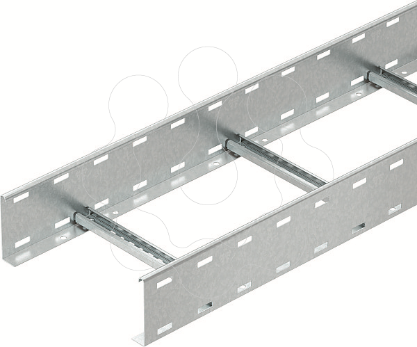 Caminho de cabos tipo escada com altura lateral de 110 mm com perfil separador C30 soldado e rebitado para cima. Travessa lateral revirada para reforço e como proteção de arestas. A fixação na consola é efetuada com peças de aperto do tipo LKS 40. A dimensão da ranhura do degrau é de 16,5 mm e a abraçadeira BBS adequada é a do tipo 2056.
