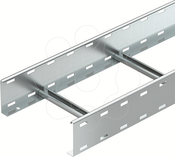 Caminho de cabos tipo escada com aba perfurada de 110 mm, degraus do perfil C abertos para cima.