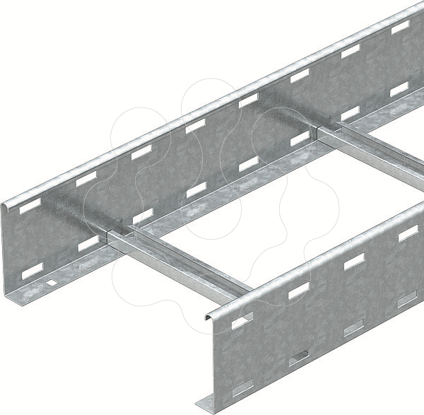 Caminho de cabos tipo escada com aba perfurada de 110 mm, degraus do perfil C abertos para cima.