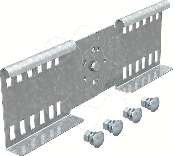 União articulada para a ligação de caminhos de cabos tipo escada com aba de 110 mm e perfuração contínua. Ângulo ajustável verticalmente.