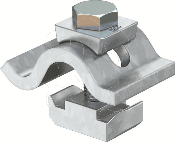 Garra de fixação, versão para pequenas cargas, com porca corrediça para a fixação de perfis em vigas de aço.