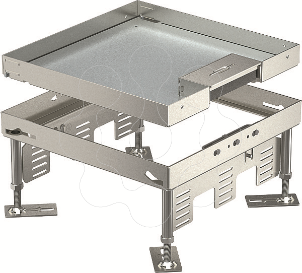 Caixa nivelável do tamanho nominal 9 com saída de cabos para montagem de aparelhos de instalação em pavimentos tratados a seco ou a húmido em interiores.