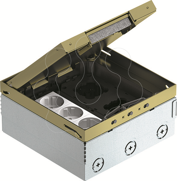 Caixa de pavimento quadrada para utilização em chão falso de limpeza a seco e betonilha em áreas interiores. Caixa com aberturas de entrada para tubos (M25). Tampa ajustável ao rebordo superior do revestimento do pavimento, através de 4 apoios de nivelamento. A profundidade mínima de montagem é de 95 mm, a amplitude de nivelamento + 30 mm.