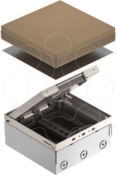 Caixa de pavimento quadrada para utilizacao em chao falso de limpeza a seco e betonilha em areas interiores. Caixa com aberturas de entrada para tubos M25. Tampa ajustavel ao rebordo superior do rev