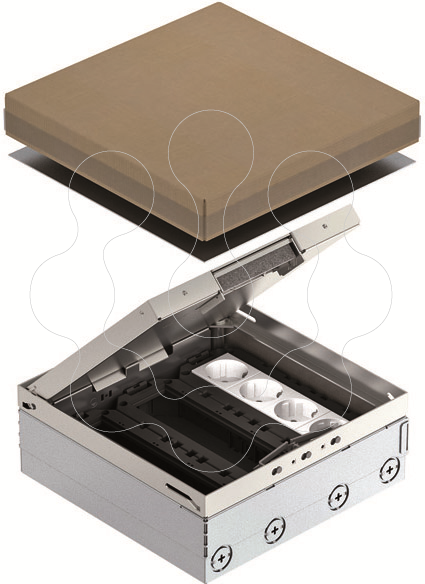 Caixa de pavimento quadrada para utilização em chão falso de limpeza a seco e betonilha em áreas interiores. Caixa com aberturas de entrada para tubos (M25). Tampa ajustável ao rebordo superior do revestimento do pavimento, através de 4 apoios de nivelamento. A profundidade mínima de montagem é de 95 mm, a amplitude de nivelamento + 30 mm.