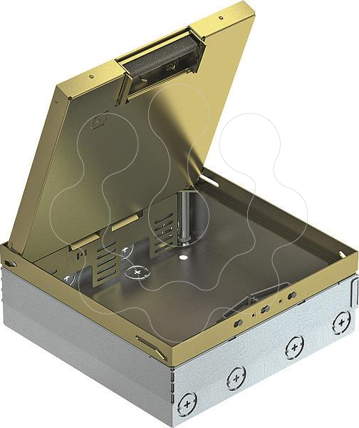 Caixa de pavimento quadrada para utilização em chão falso de limpeza a seco e betonilha em áreas interiores. Caixa com aberturas de entrada para tubos (M25). Tampa ajustável ao rebordo superior do revestimento do pavimento, através de 4 apoios de nivelamento. A profundidade mínima de montagem é de 95 mm, a amplitude de nivelamento + 30 mm.
