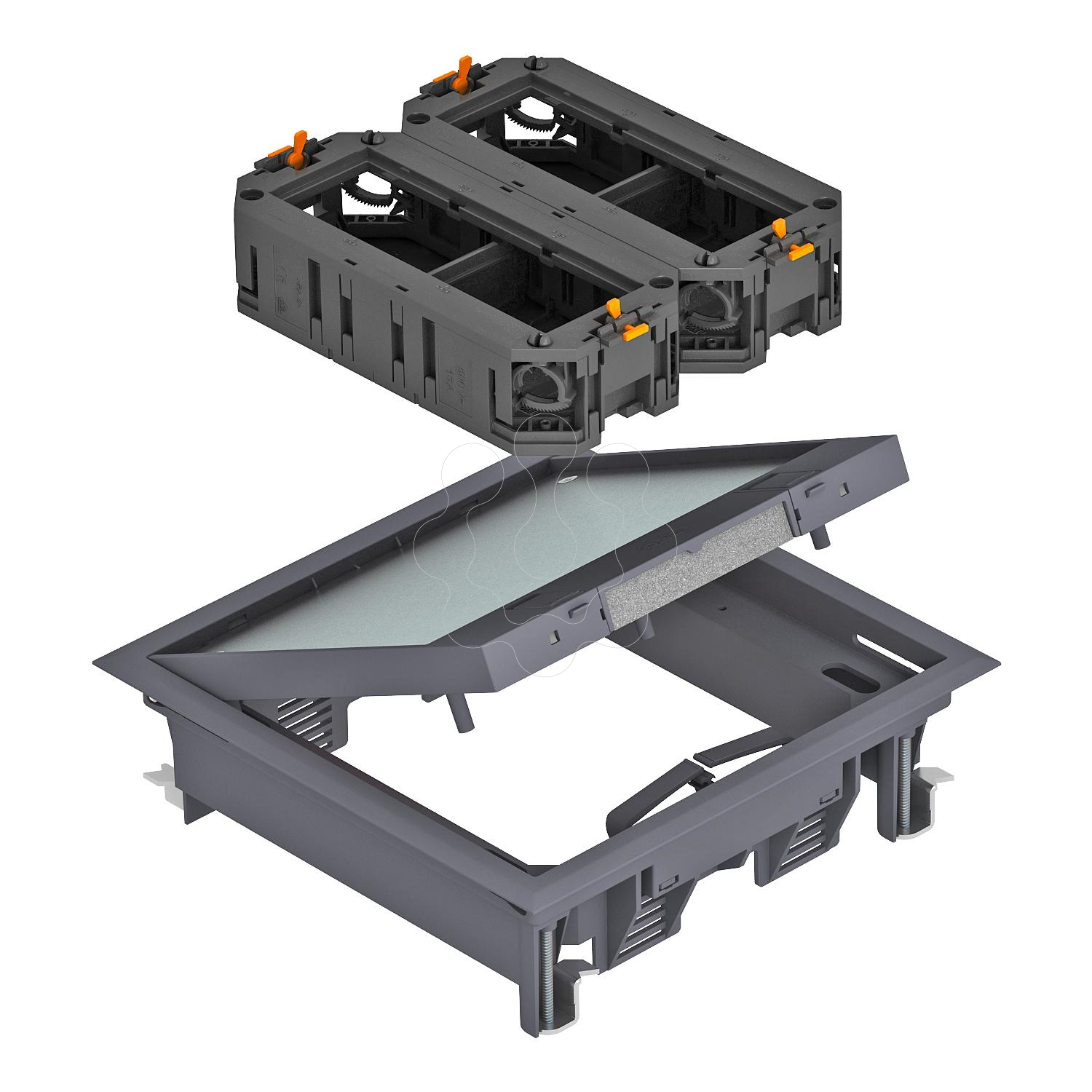 Tampa de encastramento com todos os acessórios de sistema necessários para a montagem direta em pavimentos de betonilha em interiores. O material fornecido inclui uma tampa de encastramento de tamanho 4 com esquadro de fixação universal e dois suportes de aprelhos para 6 aparelhagens de manobra Modul 45. Tampa basculante com proteção da carpete e com saída de cabos em poliamida, na cor RAL 7011. Revestimento do pavimento de 10 mm (ajustável a 3, 5 ou 8 mm) na tampa basculante.