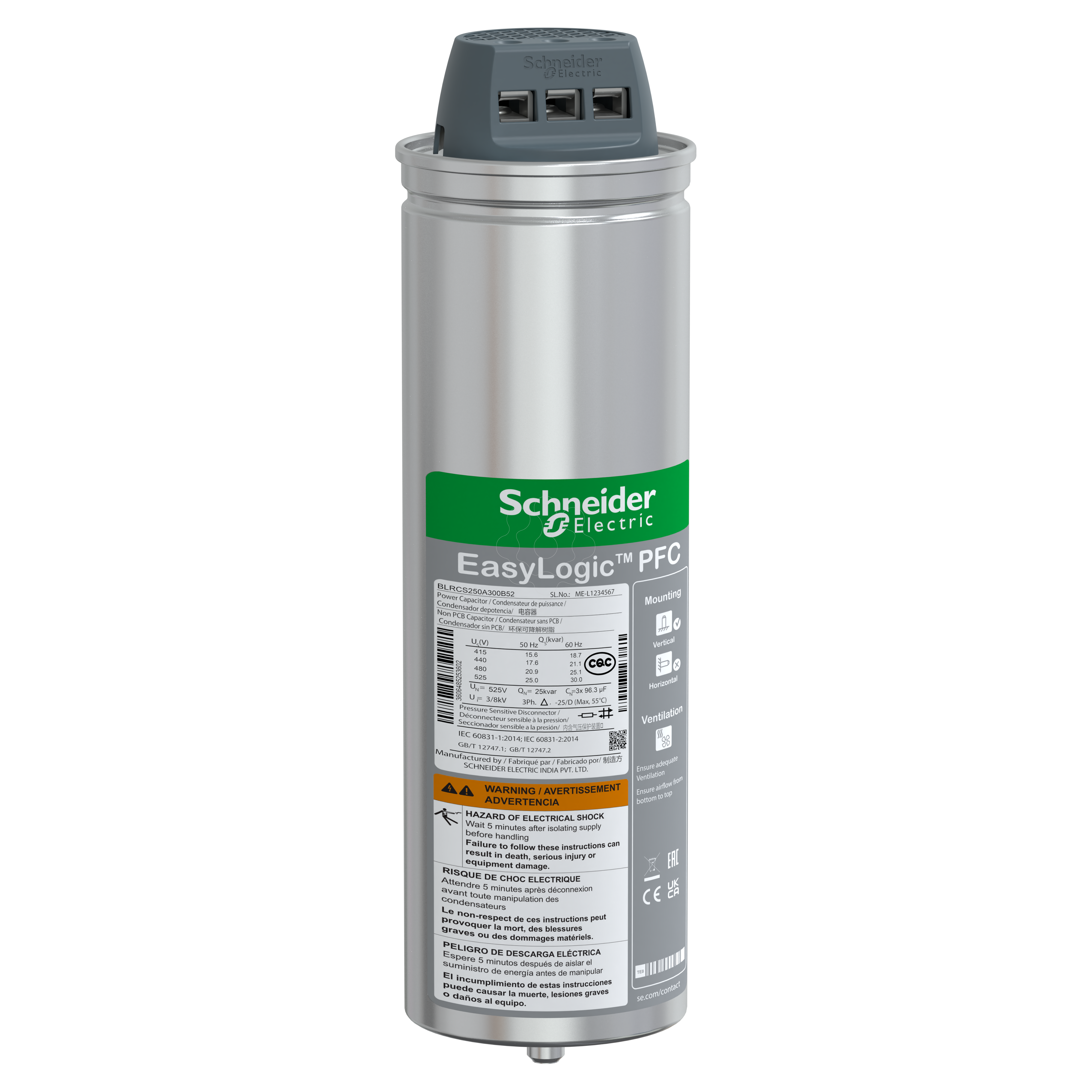 Capacitores EasyCan são projetados para trabalhar em redes levemente poluídas com reatores dessintonizados. Esses capacitores são usados para condições de operação padrão e quando não há cargas não lineares significativas. Esses capacitores são a escolha certa para maximizar a economia em um sistema elétrico estável. Este capacitor fornece uma potência de saída nominal de 20,8 kVar a 480 V CA, 50 Hz. Fixação assegurada por um terminal ClampTite. Este componente atende às normas IEC 60831-1 e IEC 60831-2. O peso do produto da caixa é de 2,3 kg.